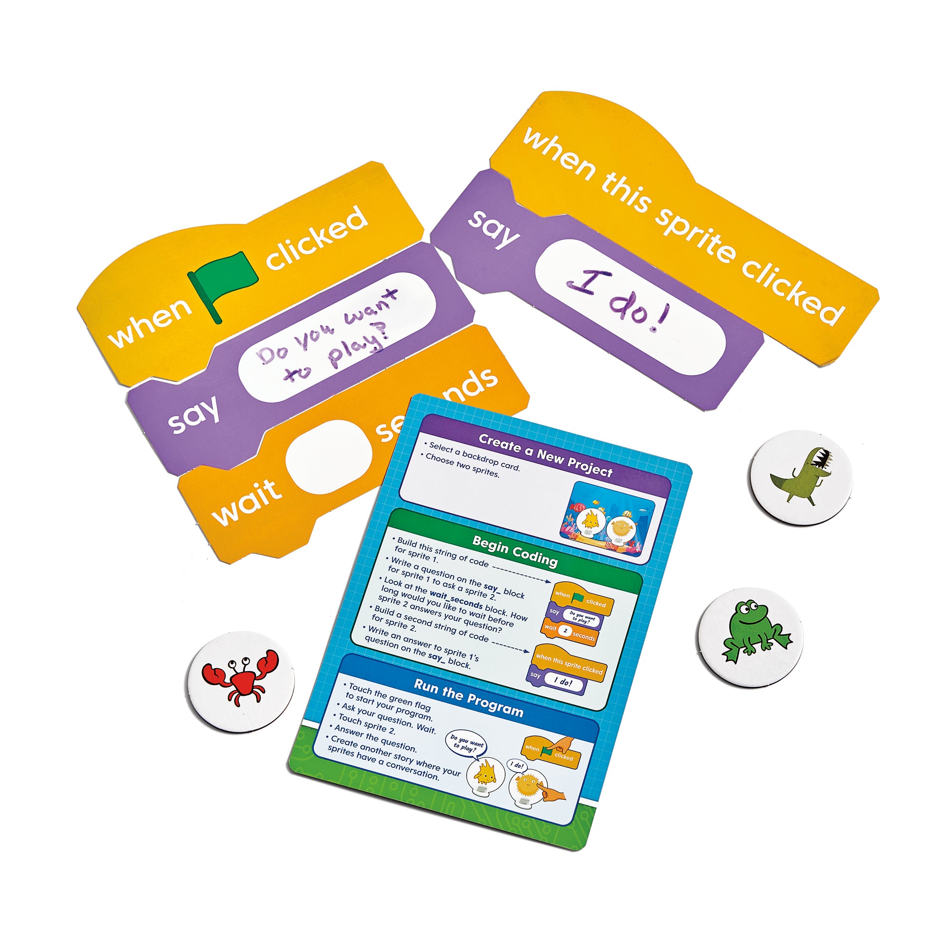 Sprite character pieces and backdrop cards allow students to act out their coding scripts.